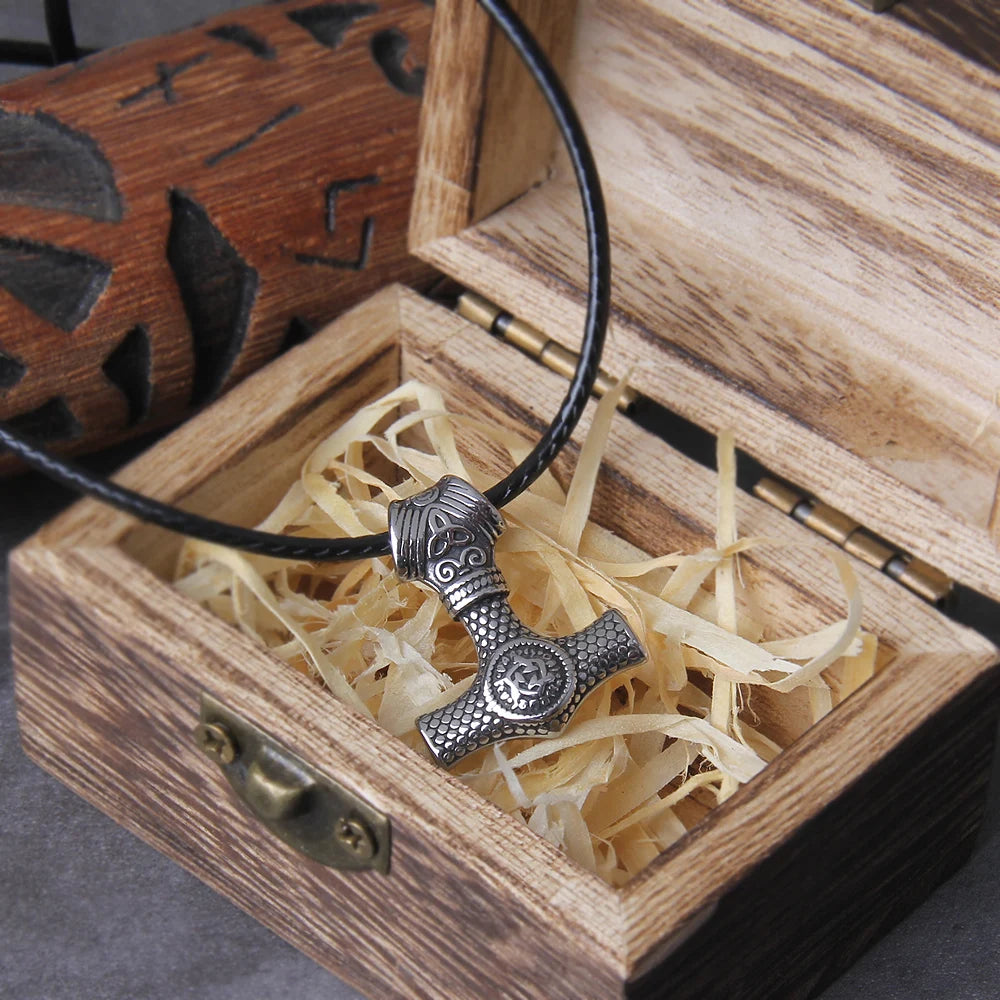 Este colar une dois símbolos sagrados da mitologia nórdica: o Mjölnir, o martelo de Thor que representa força, coragem e defesa contra o mal, e o Vegvísir, a runa de proteção que guia o portador e o impede de se perder em sua jornada.