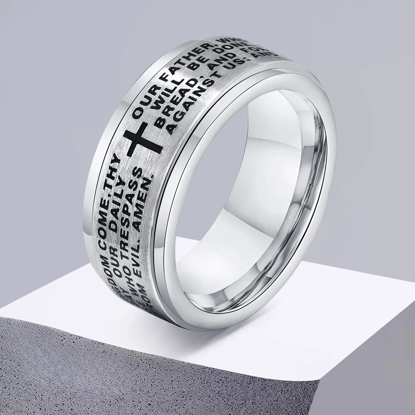 Leve sua fé consigo com este anel Our Father Spinner, gravado com a oração do Pai Nosso em inglês. Seu aro giratório proporciona um efeito calmante, ajudando a aliviar a ansiedade e a manter o foco no dia a dia.