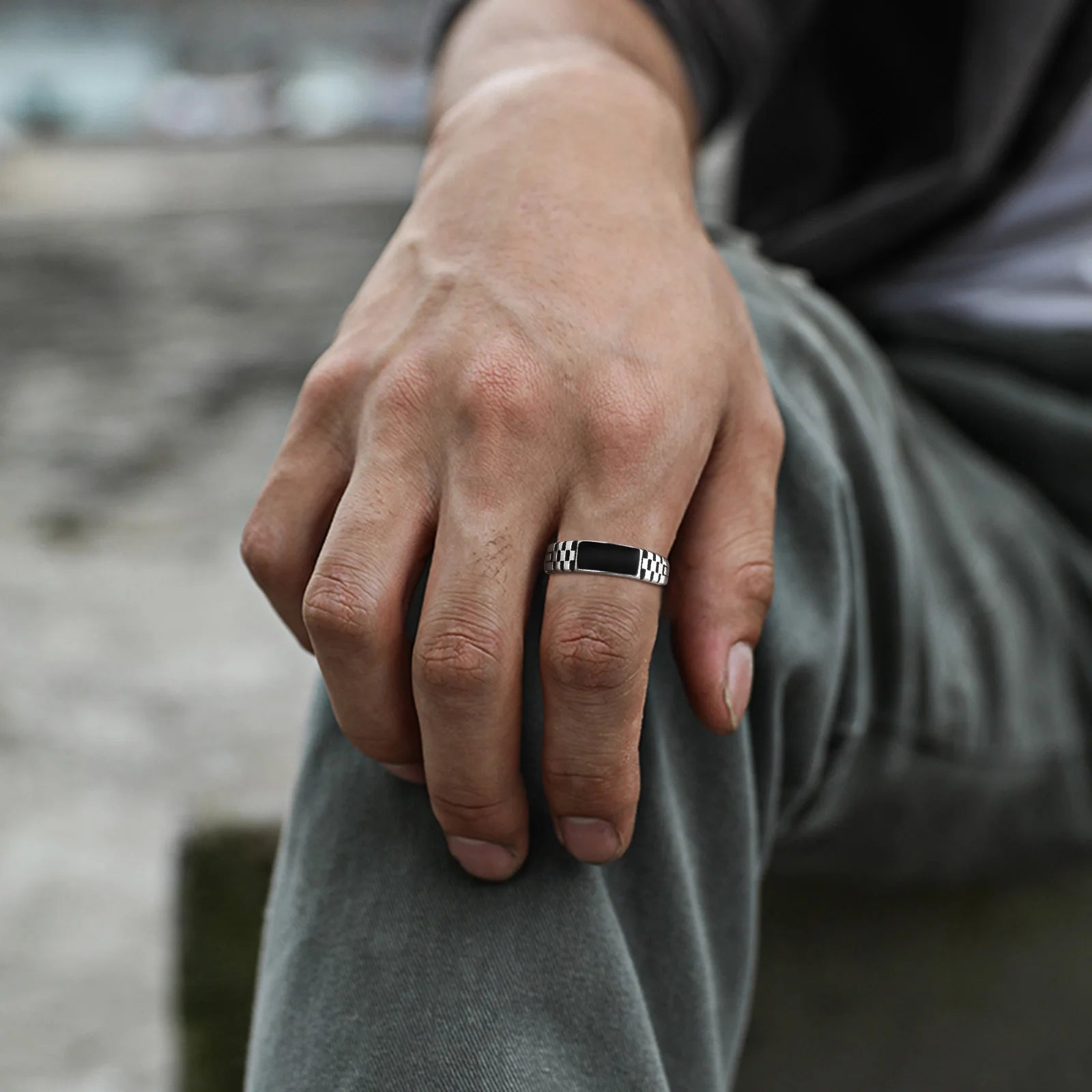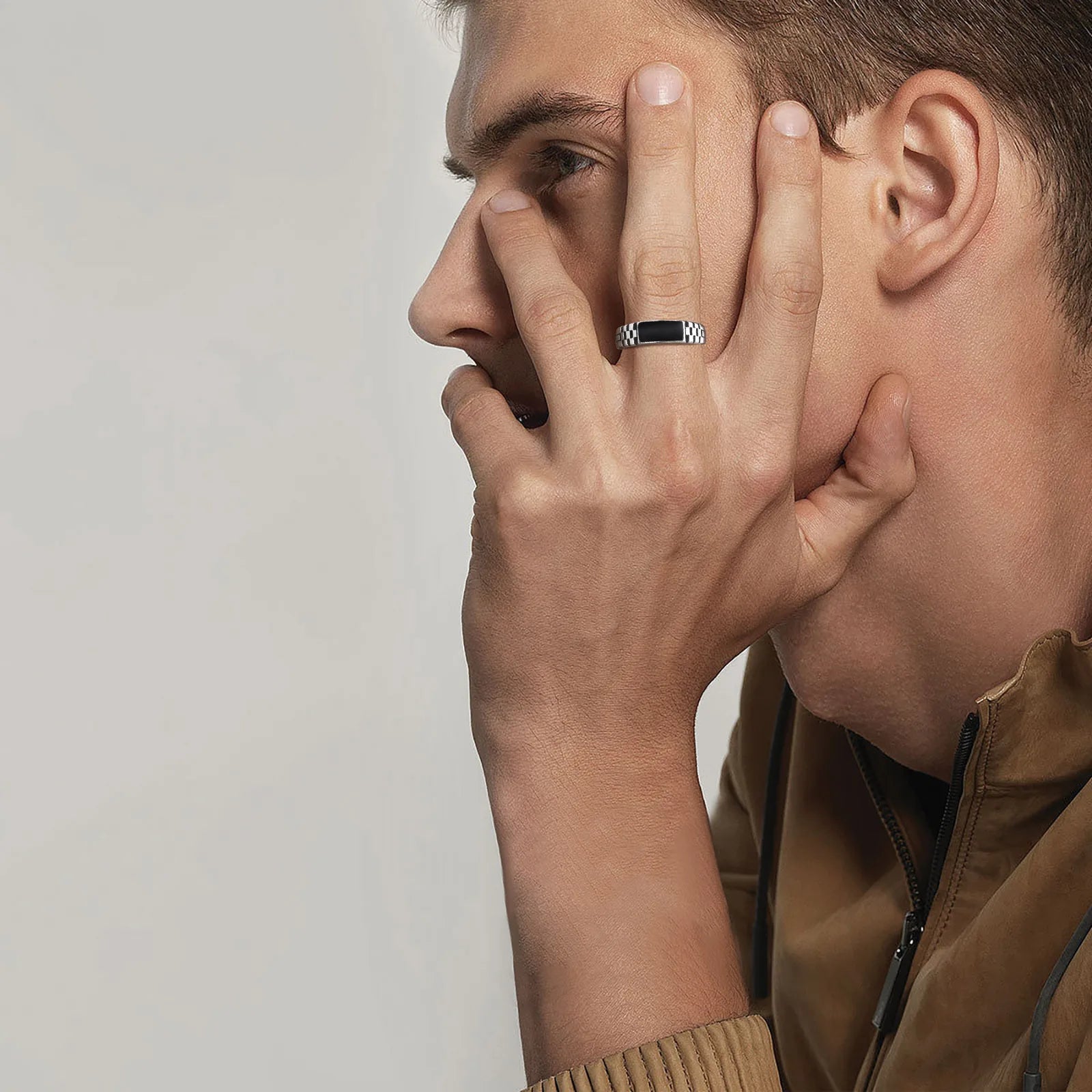 O Anel Black Silver é a combinação perfeita entre design contemporâneo e conforto. Com acabamento sofisticado em esmalte preto e textura inspirada em pulseira de relógio, ele se destaca pelo visual moderno e versátil.